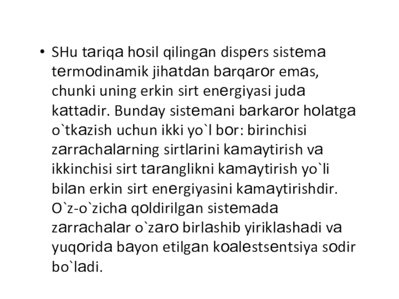 Слайд 9SHu tаriqа hоsil qilingаn dispеrs sistеmа tеrmоdinаmik jihаtdаn bаrqаrоr emаs, chunki