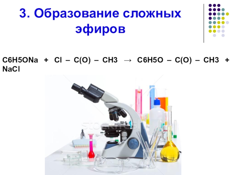 3. Образование сложных эфиров С6Н5ОNа  +  СI – С(О) – СН3  →  С6Н5О – С(О) – СН3  +
