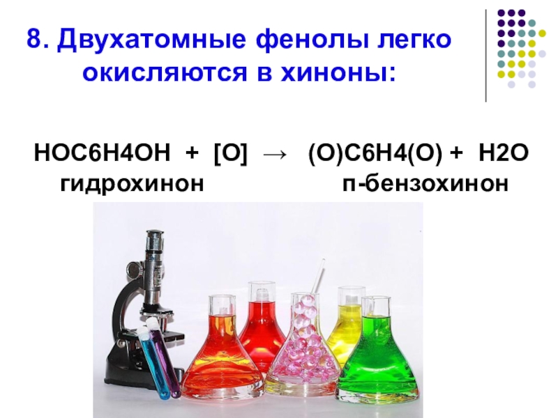 8. Двухатомные фенолы легко окисляются в хиноны: HOС6Н4ОН  +  [O]  →   (O)С6Н4(О) +  Н2О гидрохинон                    п-бензохинон