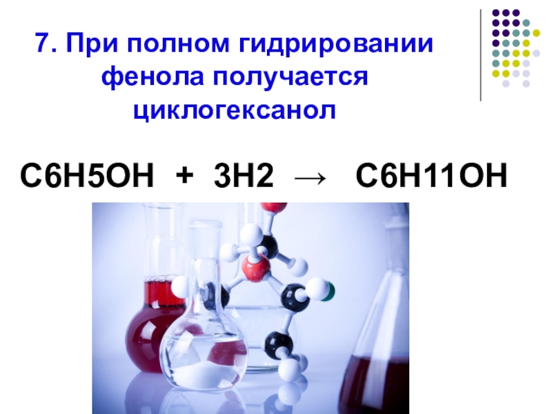 7. При полном гидрировании фенола получается циклогексанолС6Н5ОН  +  3H2  →   С6Н11ОН