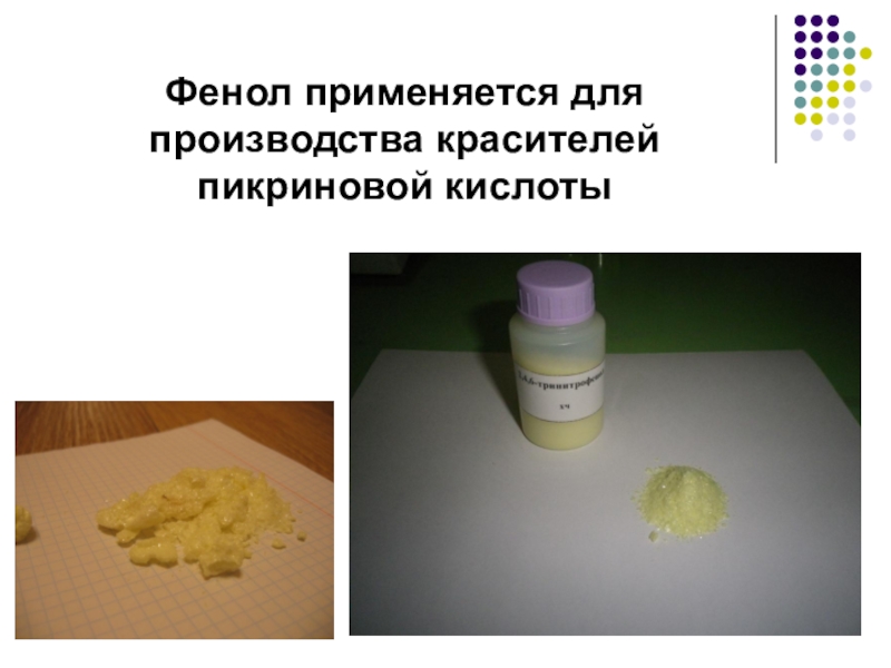 Слайд 17Фенол применяется для производства красителей пикриновой кислоты