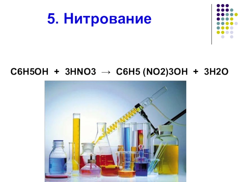 5. Нитрование С6Н5ОН  +  3НNO3  →  С6Н5 (NО2)3OH  +  3Н2О