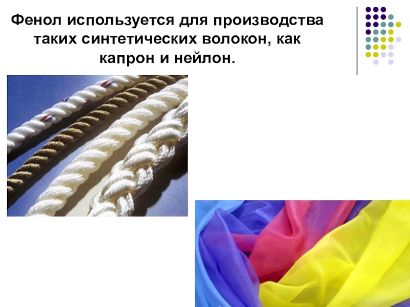 Слайд 21Фенол используется для производства таких синтетических волокон, как капрон и нейлон.