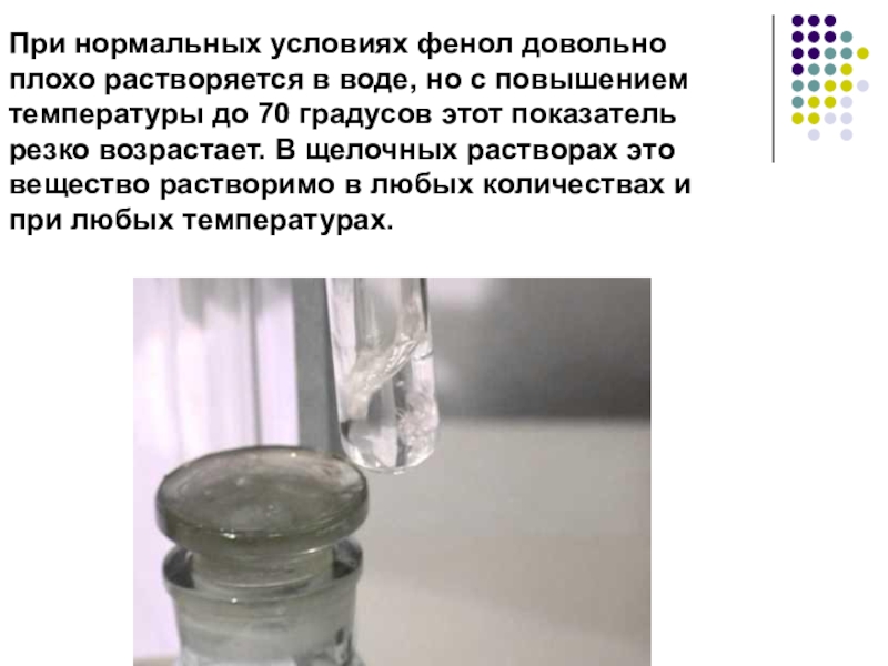 При нормальных условиях фенол довольно плохо растворяется в воде, но с повышением температуры до 70 градусов этот показатель