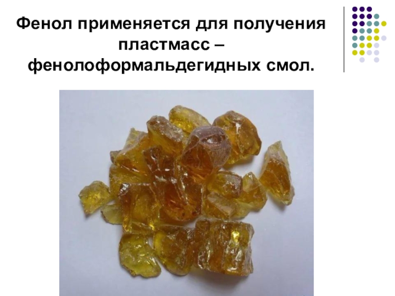 Слайд 19Фенол применяется для получения пластмасс – фенолоформальдегидных смол.