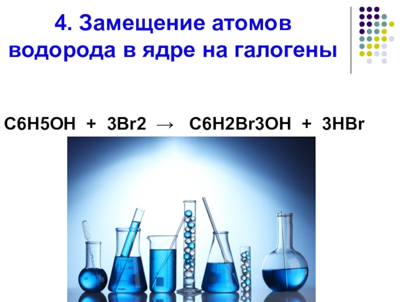 4. Замещение атомов водорода в ядре на галогены  С6Н5ОН  +  3Вr2  →   С6Н2Вr3ОН  +  3НВr