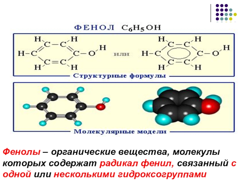 Слайд 2Фенолы – органические вещества, молекулы которых содержат радикал фенил, связанный с