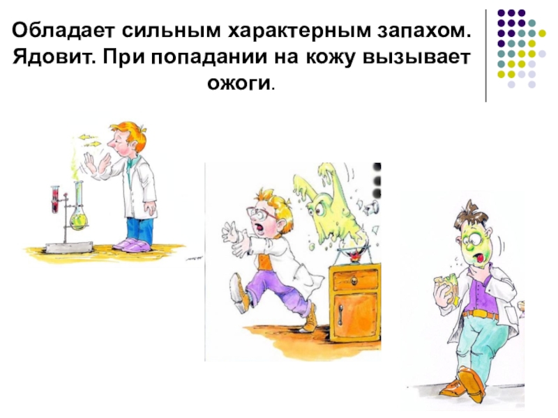 Обладает сильным характерным запахом. Ядовит. При попадании на кожу вызывает ожоги.