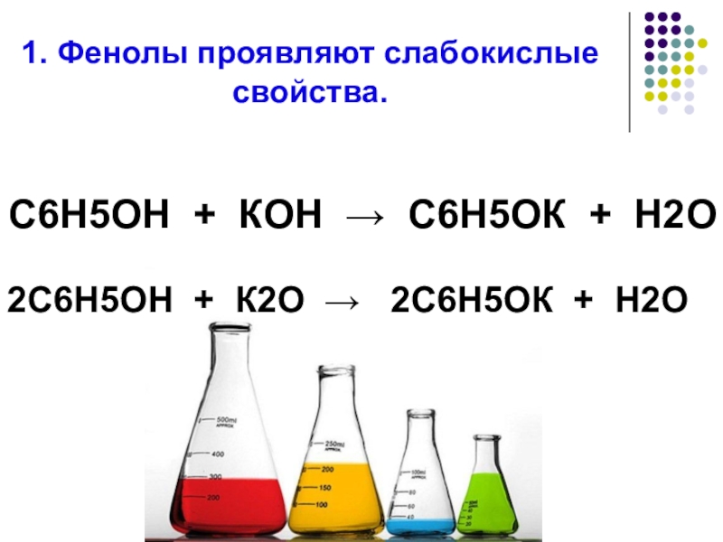 1. Фенолы проявляют слабокислые свойства.С6Н5ОН  +  КОН  →  С6Н5ОК  +  Н2О2С6Н5ОН  +  К2О  →   2С6Н5ОК  +  Н2О
