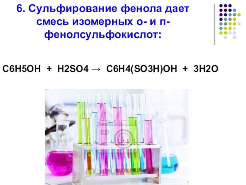 6. Сульфирование фенола дает смесь изомерных о- и п-фенолсульфокислот: С6Н5ОН  +  Н2SО4 →  С6Н4(SO3H)OH  +  3Н2О