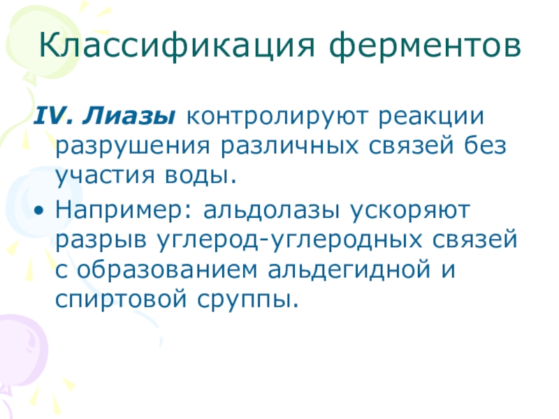 IV. Лиазы контролируют реакции разрушения различных связей без участия воды.