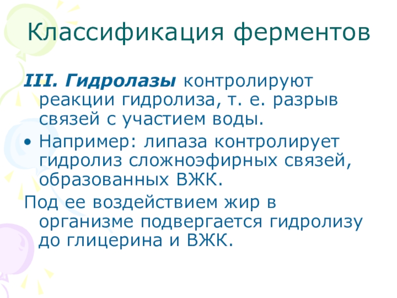 III. Гидролазы контролируют реакции гидролиза, т. е. разрыв связей с