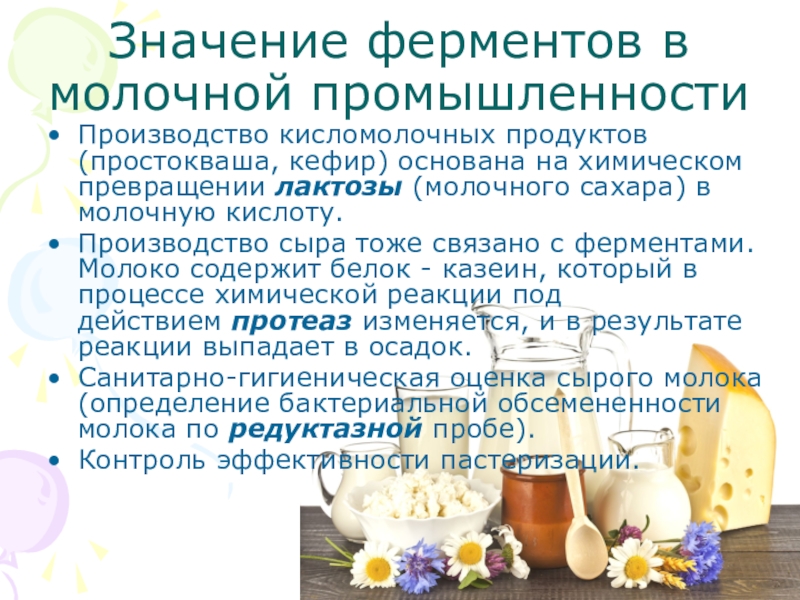 Производство сыра тоже связано с ферментами. Молоко содержит белок - казеин, который в процессе химической реакции под действием протеаз изменяется, и в результате реакции выпадает в осадок.