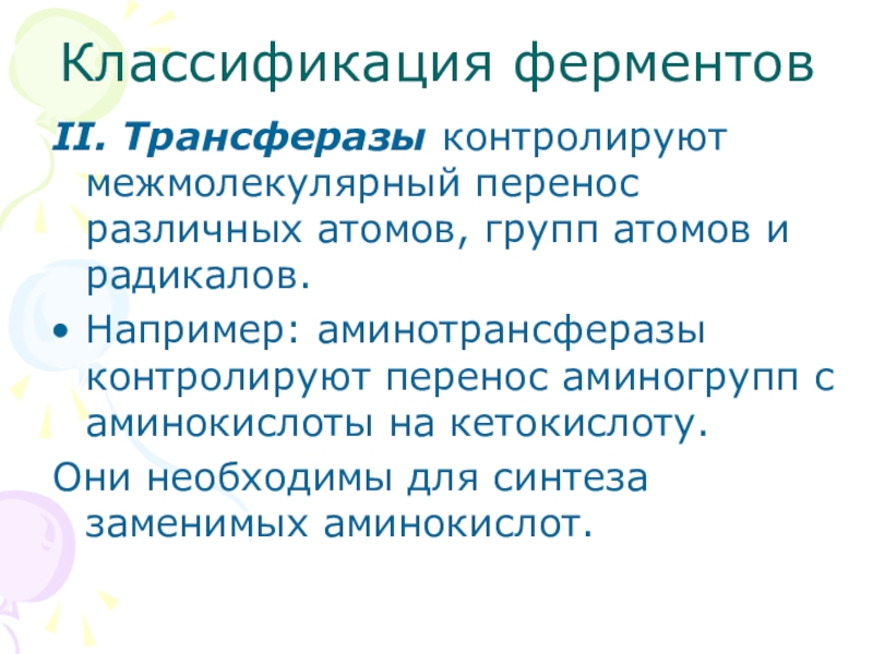 II. Трансферазы контролируют межмолекулярный перенос различных атомов, групп атомов и
