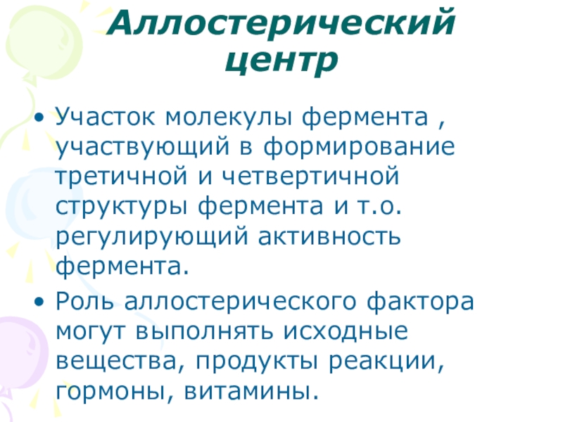 Роль аллостерического фактора могут выполнять исходные вещества, продукты реакции, гормоны, витамины.