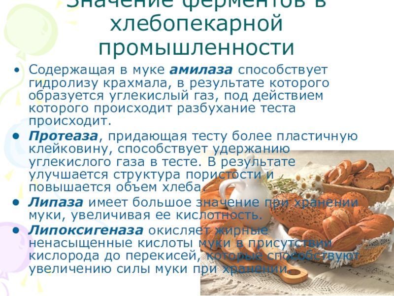 Слайд 23Значение ферментов в хлебопекарной промышленности