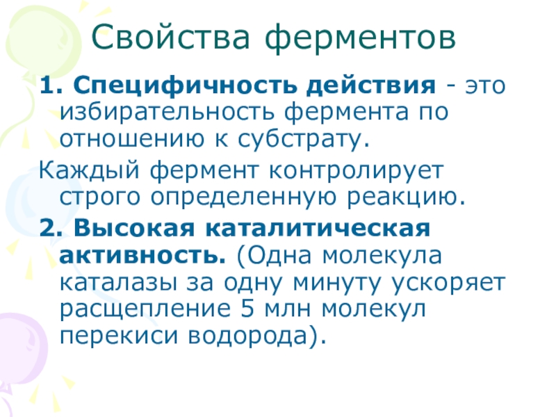 2. Высокая каталитическая активность. (Одна молекула каталазы за одну минуту ускоряет расщепление 5 млн молекул перекиси водорода).