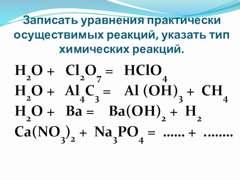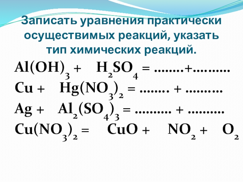 Записать уравнения практически осуществимых реакций, указать тип химических реакций.