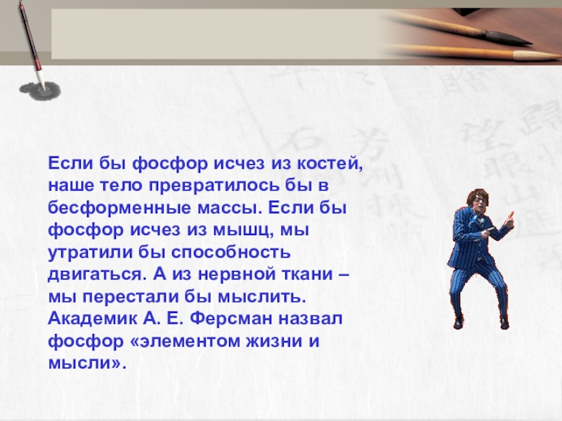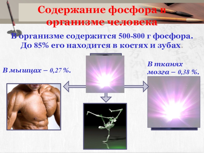 В теле человека содержится около 1,5 кг фосфора, из которых 1,4 кг приходится на кости.