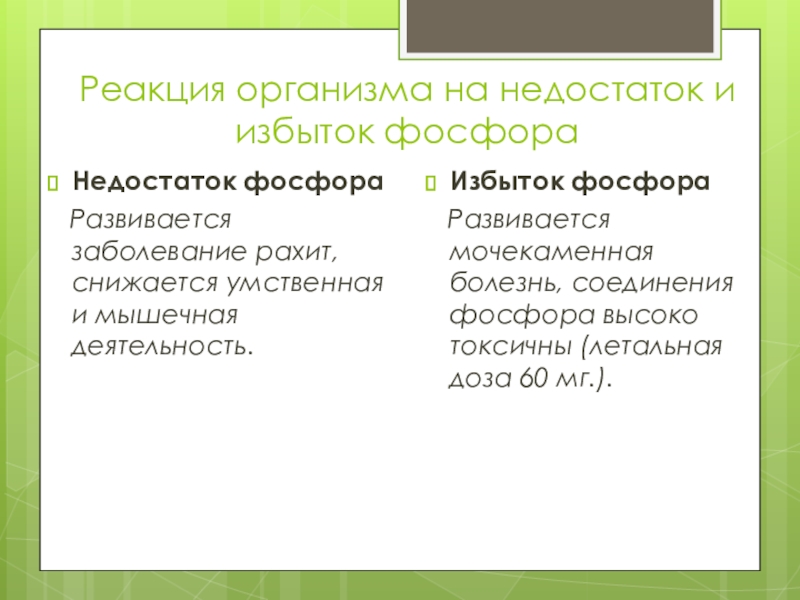 Развивается мочекаменная болезнь, соединения фосфора высоко токсичны (летальная доза 60 мг.).