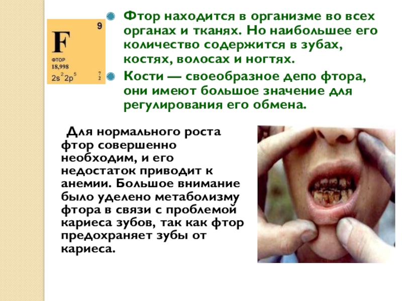 Для нормального роста фтор совершенно необходим, и его недостаток приводит к анемии. Большое внимание было уделено метаболизму фтора в связи с проблемой кариеса зубов, так как фтор предохраняет зубы от кариеса.