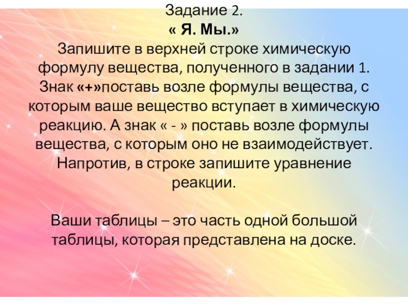 Слайд 4Задание 2. « Я. Мы.» Запишите в верхней строке химическую формулу вещества, полученного