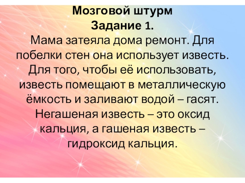 Мозговой штурм Задание 1. Мама затеяла дома ремонт. Для побелки стен она использует известь. Для того, чтобы