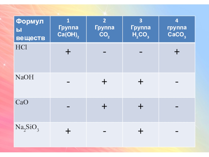 в задании 1. Знак «+»поставь возле формулы вещества, с которым ваше вещество вступает в химическую реакцию. А знак « - » поставь возле формулы вещества, с которым оно не взаимодействует. Напротив, в строке запишите уравнение реакции.   Ваши таблицы – это часть одной большой таблицы, которая представлена на доске.