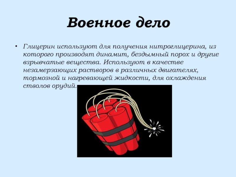Глицерин используют для получения нитроглицерина, из которого производят динамит, бездымный