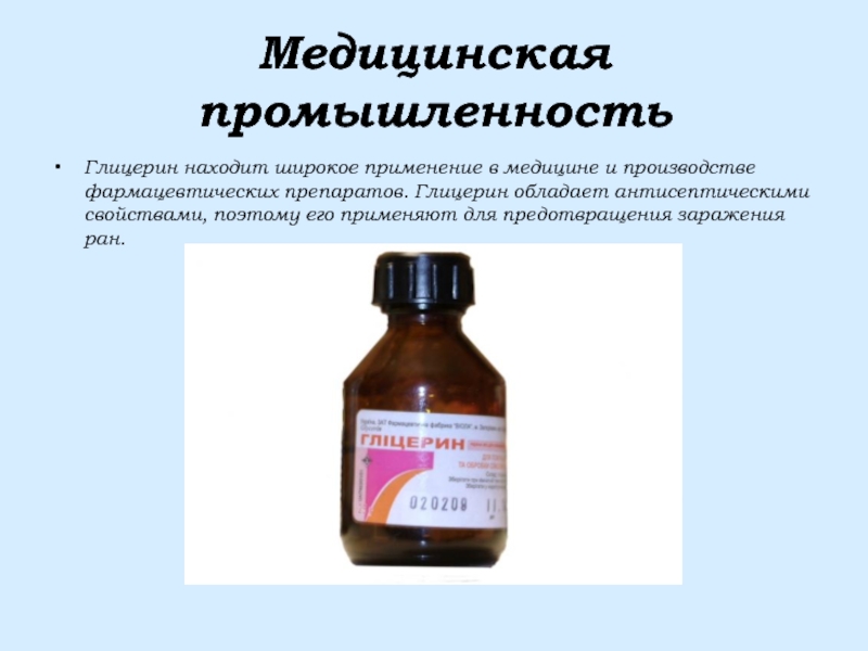 препаратов. Глицерин обладает антисептическими свойствами, поэтому его применяют для предотвращения заражения ран.