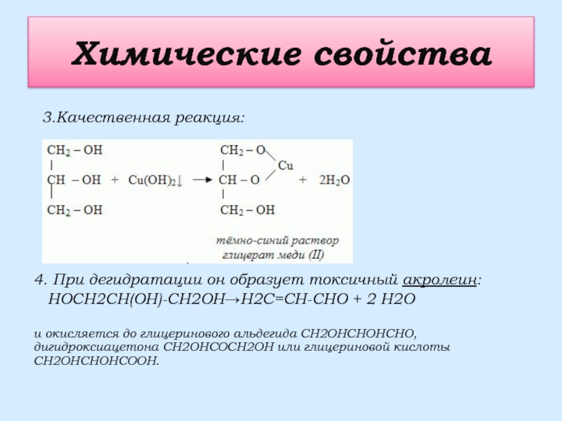 и окисляется до глицеринового альдегида CH2OHCHOHCHO, дигидроксиацетона CH2OHCOCH2OH или глицериновой кислоты CH2OHCHOHCOOH.