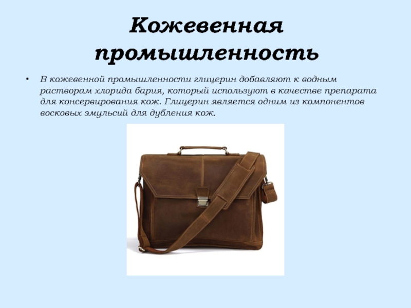 В кожевенной промышленности глицерин добавляют к водным растворам хлорида бария,