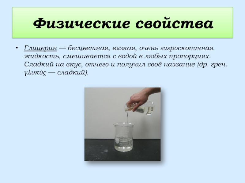 Глицерин — бесцветная, вязкая, очень гигроскопичная жидкость, смешивается с водой