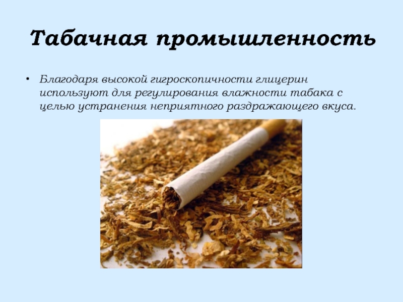 Благодаря высокой гигроскопичности глицерин используют для регулирования влажности табака