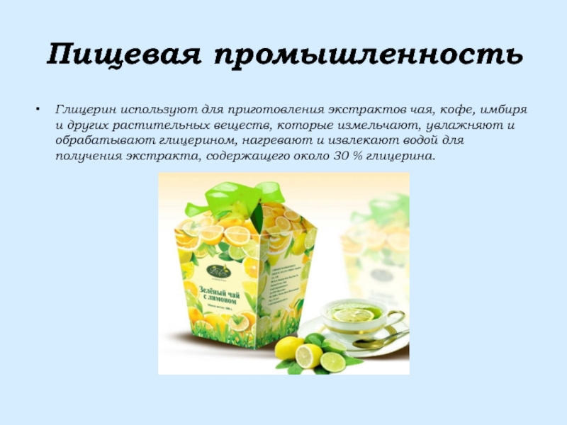 Глицерин используют для приготовления экстрактов чая, кофе, имбиря и