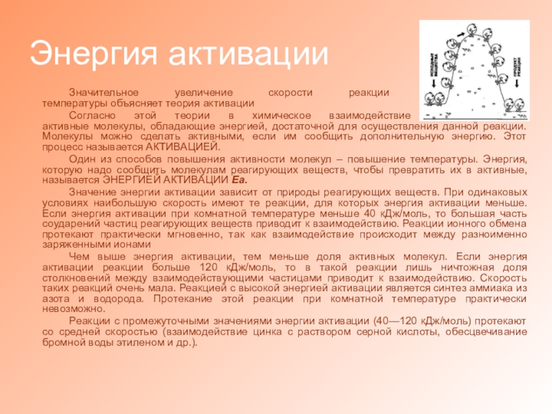 Реакция происходит при столкновении молекул реагирующих веществ, ее скорость определяется количеством столкновений и их силой (энергией).