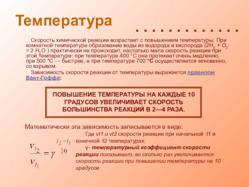 ПОВЫШЕНИЕ ТЕМПЕРАТУРЫ НА КАЖДЫЕ 10 ГРАДУСОВ УВЕЛИЧИВАЕТ СКОРОСТЬ БОЛЬШИНСТВА РЕАКЦИЙ В 2—4 РАЗА.