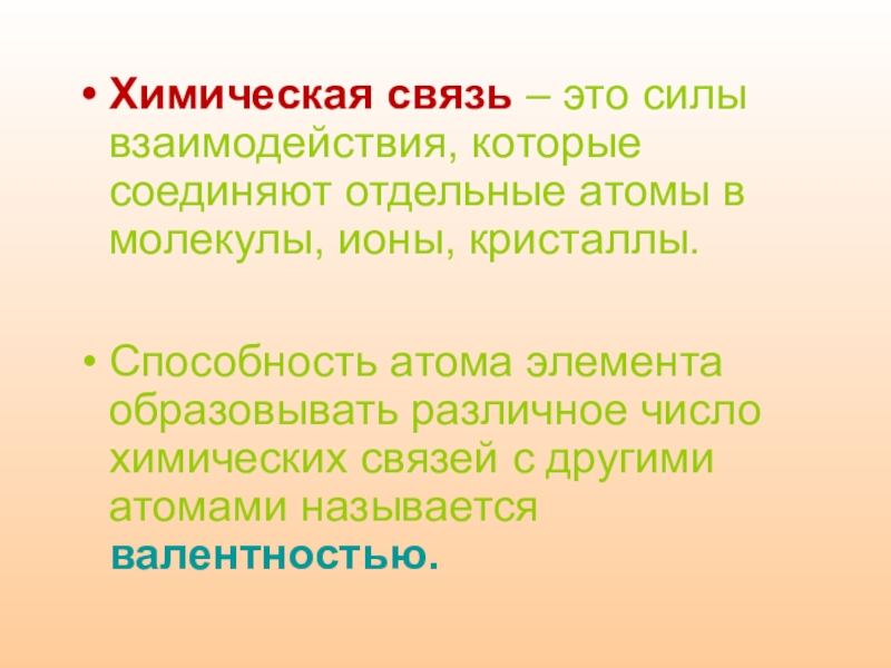 Способность атома элемента образовывать различное число химических связей с другими атомами называется валентностью.