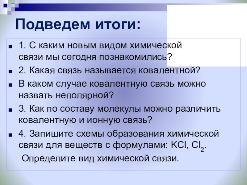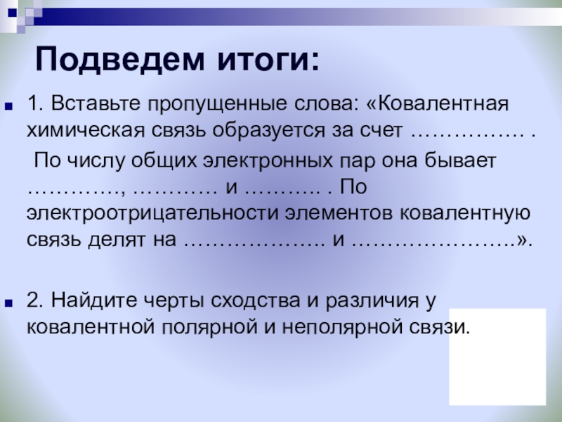 По числу общих электронных пар она бывает …………., ………… и ……….. . По электроотрицательности элементов ковалентную связь делят на ……………….. и …………………..».