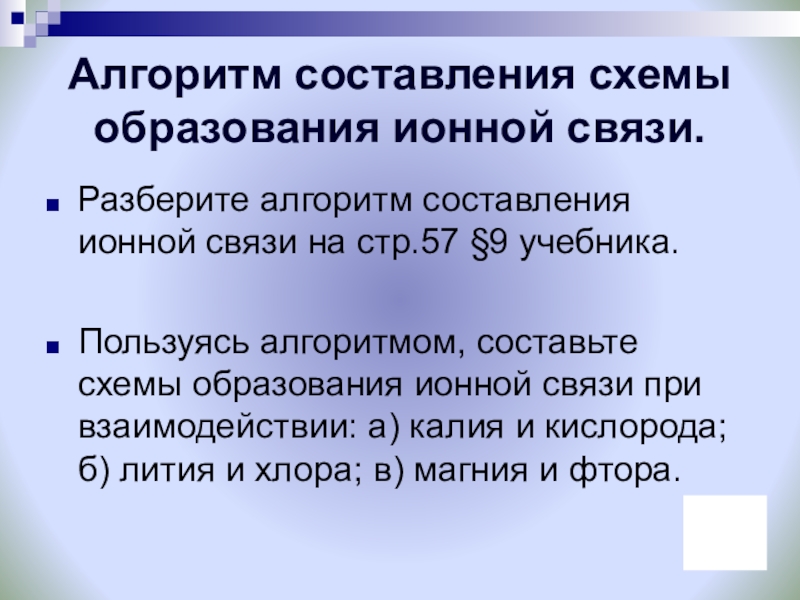 Слайд 12Алгоритм составления схемы образования ионной связи.