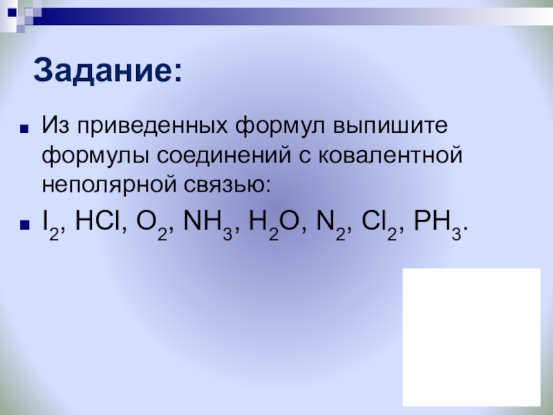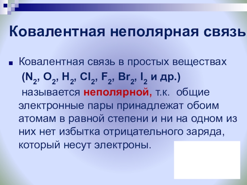ковалентная неполярная связь (H2, Cl2, N2, O2)
