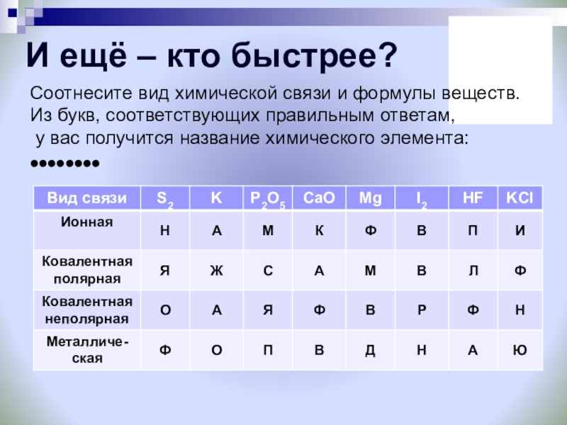 Соотнесите вид химической связи и формулы веществ.