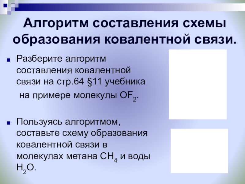 Пользуясь алгоритмом, составьте схему образования ковалентной связи в молекулах метана СН4 и воды Н2О.