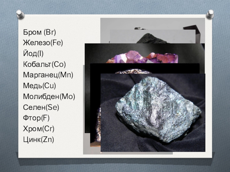 Бром (Br)Железо(Fe)Йод(I)Кобальт(Co)Марганец(Mn)Медь(Cu)Молибден(Mo)Селен(Se)Фтор(F)Хром(Cr)Цинк(Zn)