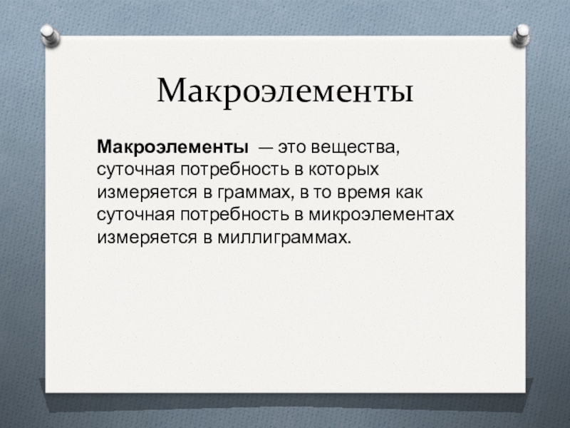 МакроэлементыМакроэлементы  — это вещества, суточная потребность в которых измеряется в граммах, в то время как суточная потребность