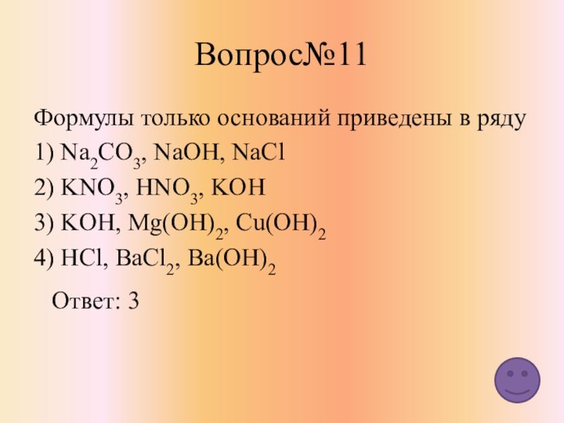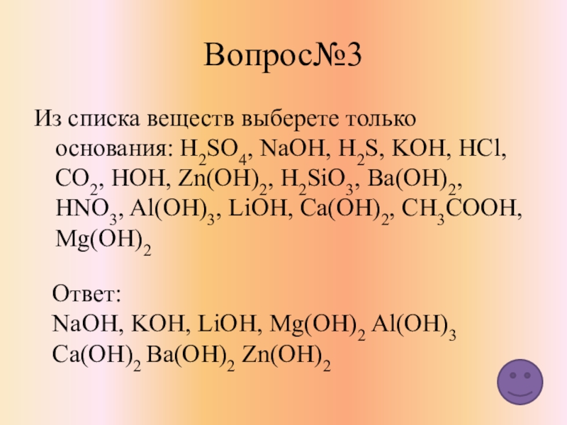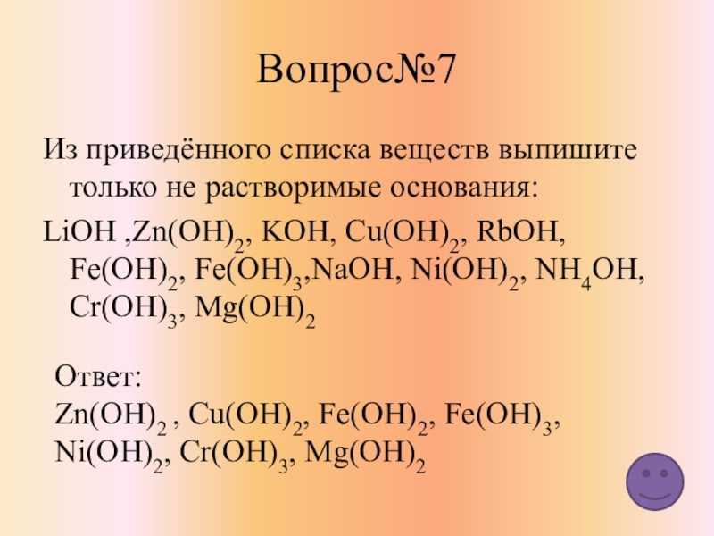 NaOH, Ca(OH)2 , Fe(OH)3 , Cu(OH)2 CsOH