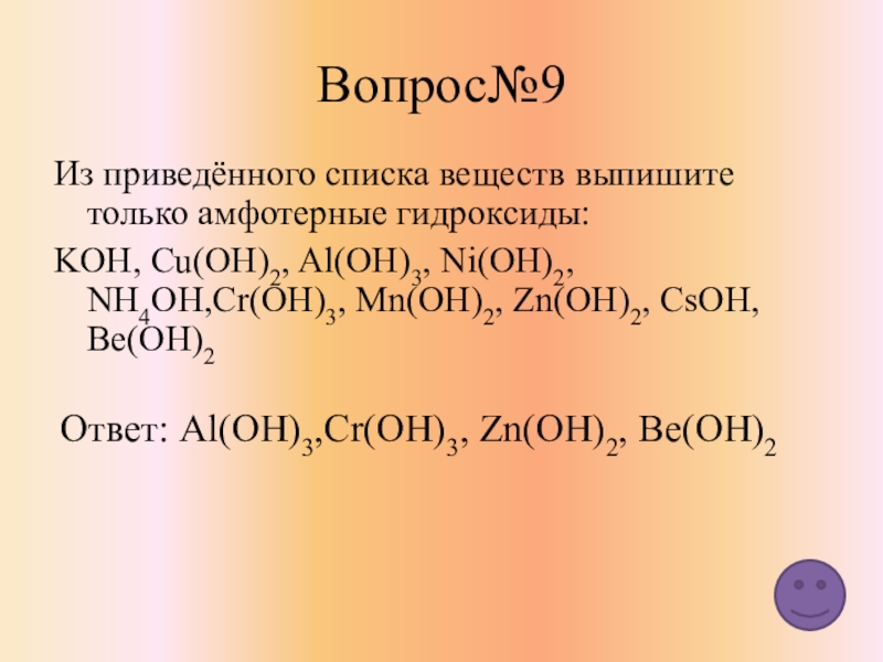 Ответ: Al(OH)3,Cr(OH)3, Zn(OH)2, Be(OH)2