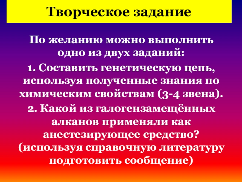 2. Какой из галогензамещённых алканов применяли как анестезирующее средство? (используя справочную литературу подготовить сообщение)