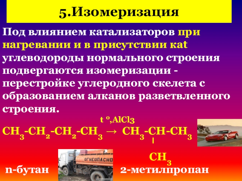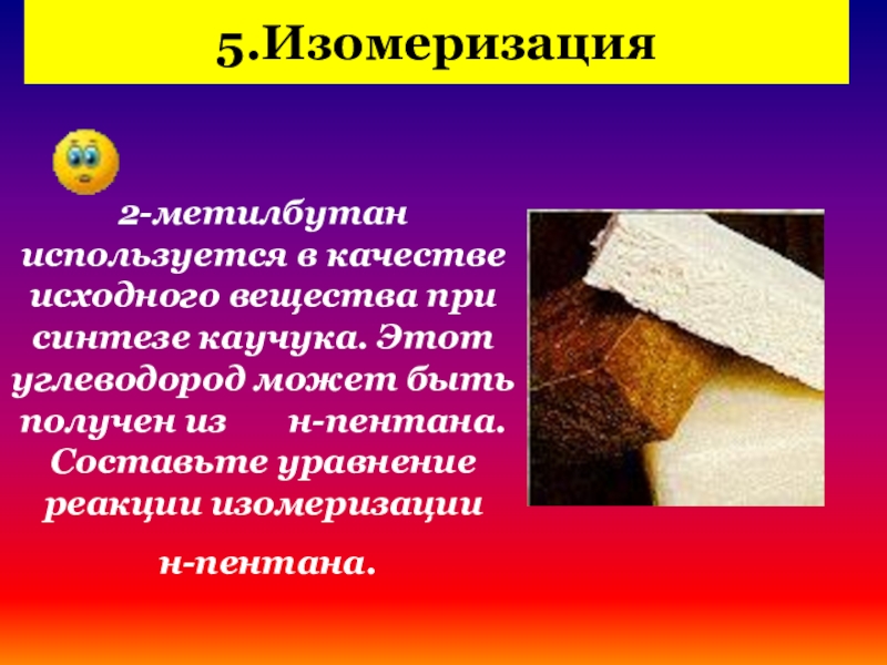 2-метилбутан используется в качестве исходного вещества при синтезе каучука. Этот углеводород может быть получен из н-пентана. Составьте уравнение реакции изомеризации