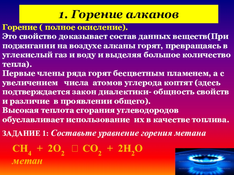 Первые члены ряда горят бесцветным пламенем, а с увеличением числа атомов углерода коптят (здесь подтверждается закон диалектики- общность свойств и различие в проявлении общего).